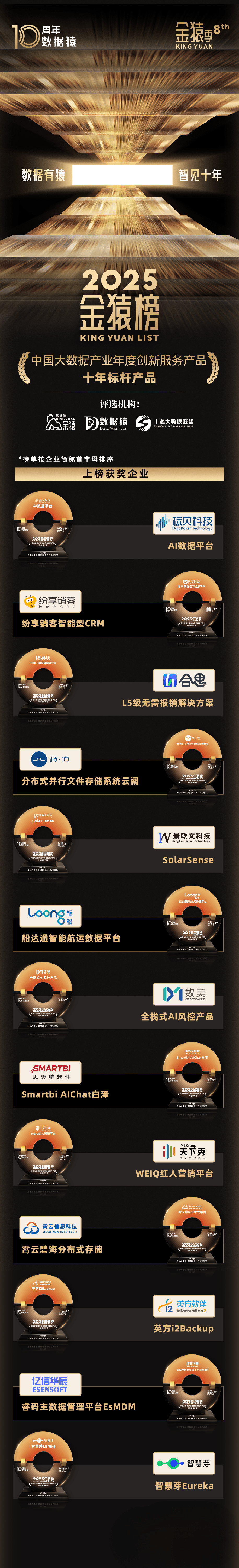 “第八届年度金猿季筹谋勾当——《2025中国大数据财产年度立异办事产物「十年标杆产物」》榜单/项”由金猿组委会第八届金猿大数据财产成长论坛正在上海市数据局的指点下,由金猿组委会、数据猿、上海市数商协会及上海大数据联盟结合倡议。自2015年《推进大数据成长步履纲要》将大数据提拔至国度计谋以来,中国大数据财产已送来成长的第一个十年。本届论坛以“数据有猿·智见十年”为从题,旨正在冲破手艺层面的会商,从财产演进、贸易模式、组织形态取文化认知等多注沉角,正在十年积淀的根本上,从头探索智能时代数据的素质取鸿沟,瞻望其将来成长的深远可能。本届金猿季,正在历经数月的时间里,近千家参取申报标的目的金猿评选委员会提交了浩繁丰硕出色的申报内容材料,最终由数据猿组建的初审小组、焦点粉丝构成的团,以及外部行业专家构成的终审评委团,通过间接申报交换、调研、征询评价、匿名拜候等交叉验证的层层筛选的评审机制下,十年标杆产物、CIO、数据要素、AI Infra、立异手艺、Data Agent、国产化类别榜单/项申报方,均正在第八届金猿颁仪式现场获颁荣誉杯(手艺项还获颁一份手艺团队荣誉证书)予以激励,并正在数据猿20+国内播发布渠道,以及100+外部合做同步全网,面向包罗金融、工业、医疗、消费、政务等正在内的全行业,展现大数据取人工智能、云计较、物联网等新手艺融合下的落地使用取成长潜力。