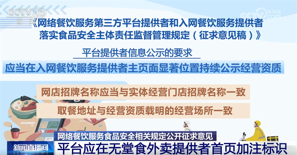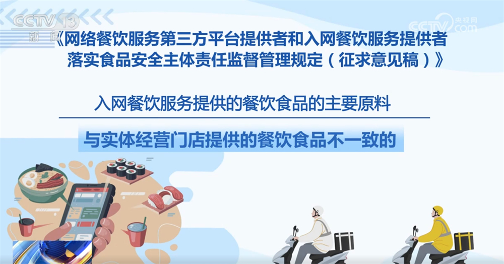 记者16日从市场监管总局领会到,为进一步加强收集餐饮办事食物平安监管,《收集餐饮办事第三方平台供给者和入网餐饮办事供给者落实食物平安从体义务监视办理(收罗看法稿)》面向社会公开收罗看法。这份办理收罗看法稿有哪些亮点?一路来领会。收罗看法稿明白了平台供给者收集餐饮办事食物平安从体义务,要求对入网餐饮办事供给者的运营天分、加工制做、卫生等进行监测和抽查。每月线下抽查入网餐饮办事供给者的比例不低于百分之五,两年内实现全笼盖。监测和抽查成果留存备查,留存刻日不得少于2年。平台供给者该当将入网餐饮办事供给者运营天分取省级市场监视办理部分从体天分消息进行校验比对,校验不成功的不得上线运营。画面笼盖餐饮食物加工制做的环节过程,并一般运转。同时,要求不得将订单委托其他餐饮办事供给者加工制做。对餐饮食物进行包拆、封口,并封口后无法回复复兴和便于消费者辨识,防止餐饮食物正在配送过程中遭到污染。